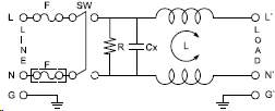 | Model No. | Rated Current @40°C | Terminal Options* | Bleeder resistor (optional) | G | Leakage current 250V/50Hz | Electrical Schematic | Rated Voltage(V) | Operating Frequency(Hz) | |||||||||||||||||||||||||||||||||||||